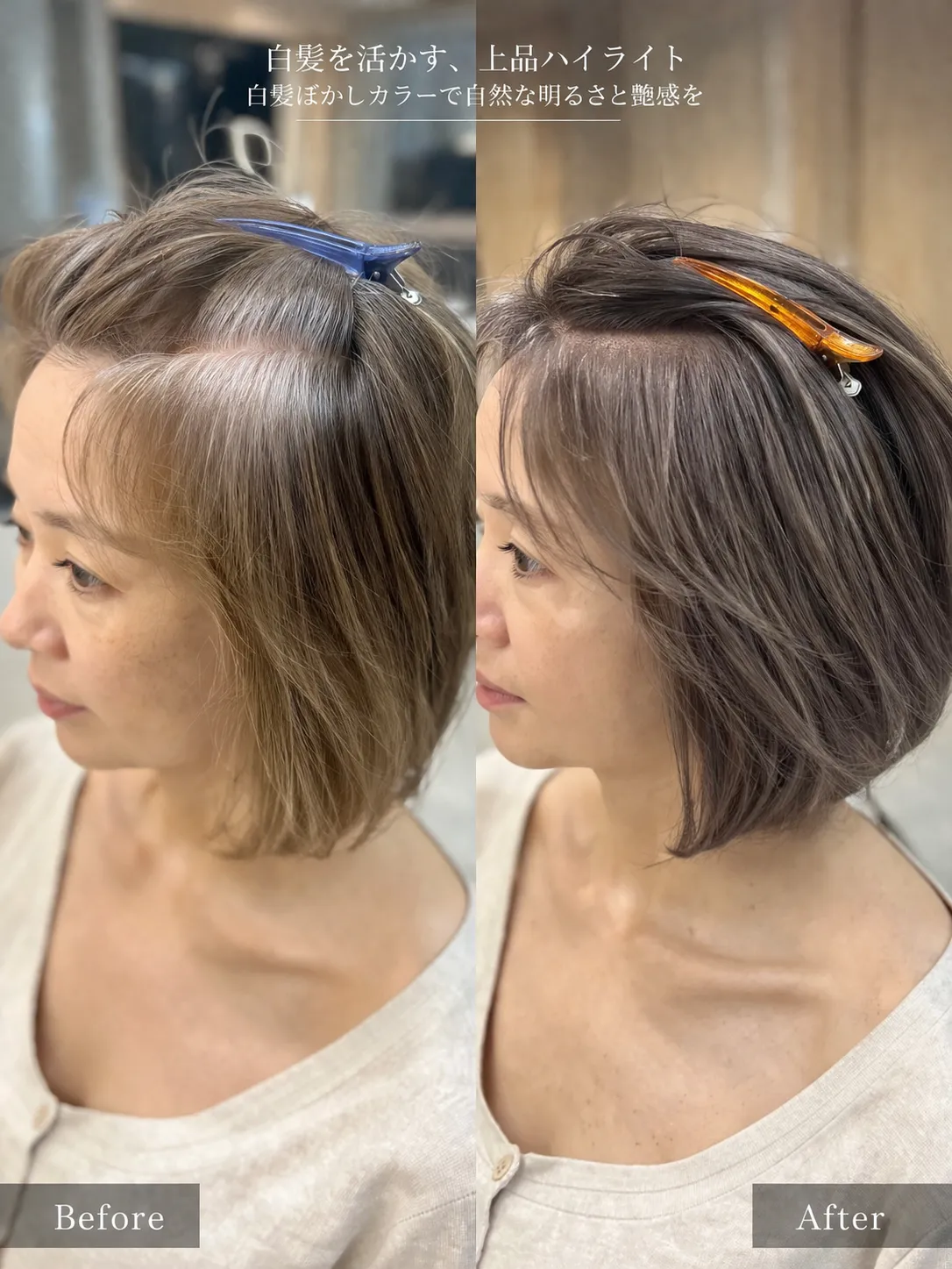 実際に、写真のお客様も白髪染めを卒業し、ナチュラルな仕上がりを楽しんでいます♪